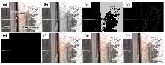 Figure 3. The image processing method for recognizing the copper wire: (a) original image, (b) gray image; (c) thresholding, (d) edge detection; (e) line detection, (f) contours; (g) selected contours; (h) middle line. Scale bar: 500 μm.