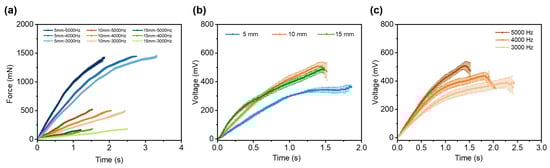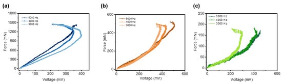 Next, we present the relationship between the output voltage and the measured force under different actuation frequencies and free lengths in Figure 5. As shown in Figure 5a, the voltage–force relationship is approximately linear up to about 300 mV. Beyond this point, the response becomes nonlinear and eventually plateaus due to the dynamic sensitivity limit of the sensor. Furthermore, the slope at 5000 Hz is sharper than that at lower frequencies, and its inflection point occurs at a higher force, indicating both greater measurement sensitivity and a wider dynamic range. A similar trend is observed for free lengths of 10 mm (Figure 5b) and 15 mm (Figure 5c). The variation in slope among these curves comes from the dynamic response characteristics of the sensor. When the actuation frequency is higher, the resulting faster movement speed causes more rapid deformation of the sensor, thereby producing a sharper slope in the response curve. Based on these results, we select an actuation frequency of 5000 Hz for all subsequent experiments as it provides the highest sensitivity and largest measurement span across all free lengths.