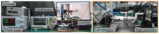 The experimental setup for the shear strength characterization is shown in Figure 7. The experimental setup consists of the left microrobot (ECS3030, Attocube, Germany) with a soft sensor, the right microrobot (MN3-18, Mechonics, Germany) with a sample fixed stage, a microscope (Dino, am73915mzt), a power supply (A-BF, SS-305DM-2), and an oscilloscope (Rigol DS-1202). The soft force sensor is mounted on the left microrobot using a 3D-printed holder. The sample is fixed to a stainless steel sheet with adhesive tape (3M). Due to assembly tolerances, the initial position of the sample may not be properly aligned. Therefore, at the beginning of the measurement process, the microrobot moves within the X–Y plane to ensure the correct positioning of the sample. The robot then moves along the Z-axis to apply a shear force to the sample.