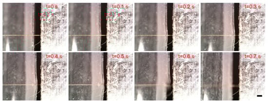 Figure 9. The experimental images of the shear process for measuring shear strength of copper wire. Scale bar: 200 μm. Between t = 0.1 s and 0.6 s, sensor deformation increases with applied force, followed by abrupt shear failure of the copper wire between t = 0.6 s and 0.7 s.