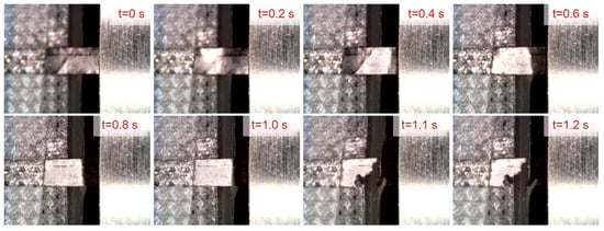 The shear strength of a 25 μm thick graphite film (Yige, China) is subsequently evaluated. The voltage–time profiles from five independent tests are presented in Figure 10, all of which exhibit consistent trends, thereby demonstrating the high repeatability of the proposed measurement method. A representative experimental sequence is illustrated in Figure 11. From t = 0 s to t = 1.0 s, the sensor moves along the z-axis, during which the displacement of the graphite film is visibly observed via reflection. Fracture of the graphite film occurs abruptly between t = 1.0 s and t = 1.1 s. The measured shear strength values from the five experiments are summarized in Table 2. Although the maximum voltage differs, the shear strength measurement result is very close due to the size variation. The results are 3.65 MPa, 3.69 MPa, 3.62 MPa, 3.56 MPa, and 3.51 MPa, yielding a mean shear strength of 3.61 MPa with a standard deviation of 0.067 MPa. The low standard deviation and coefficient of variation (1.86%) further confirm the high repeatability of the measurements. The close agreement between all five trials underscores the robustness of the methodology.