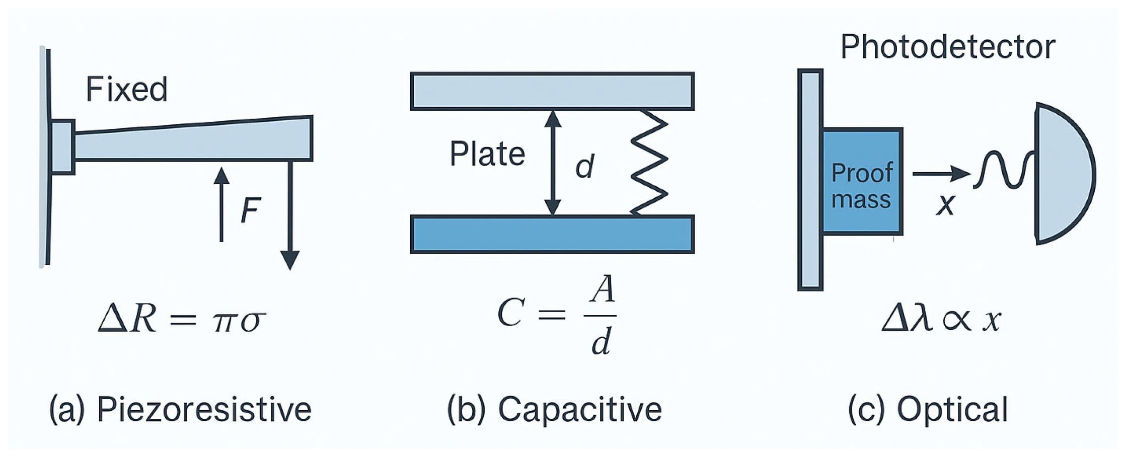 Capacitive sensing detects variations in capacitance resulting from changes in distance or dielectric properties between electrodes. The capacitance (C) is expressed as: C = εA/d, where (ε) is the permittivity of the dielectric medium, (A) is the electrode area, and (d) is the separation distance. Capacitive MEMS sensors are preferred for inertial measurement units (IMUs) and pressure sensors due to their high sensitivity, low noise, and low power consumption. Their main drawback is susceptibility to parasitic capacitance and environmental noise.