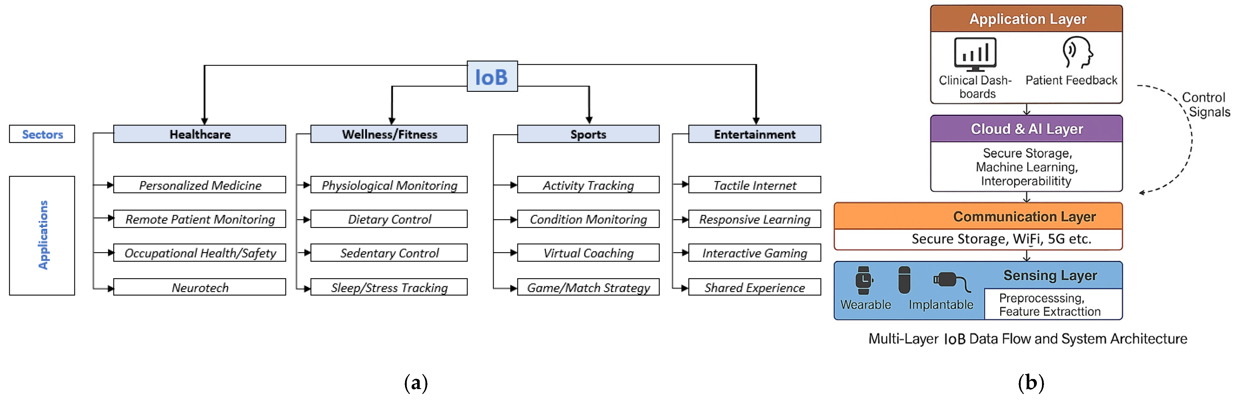 Table 2. Summary of Internet of Things (IoT) applications across diverse domains, illustrating the breadth of data-driven systems. The IoB constitutes a human-centric branch of this expanding digital ecosystem, focused on physiological data collection and healthcare optimization.