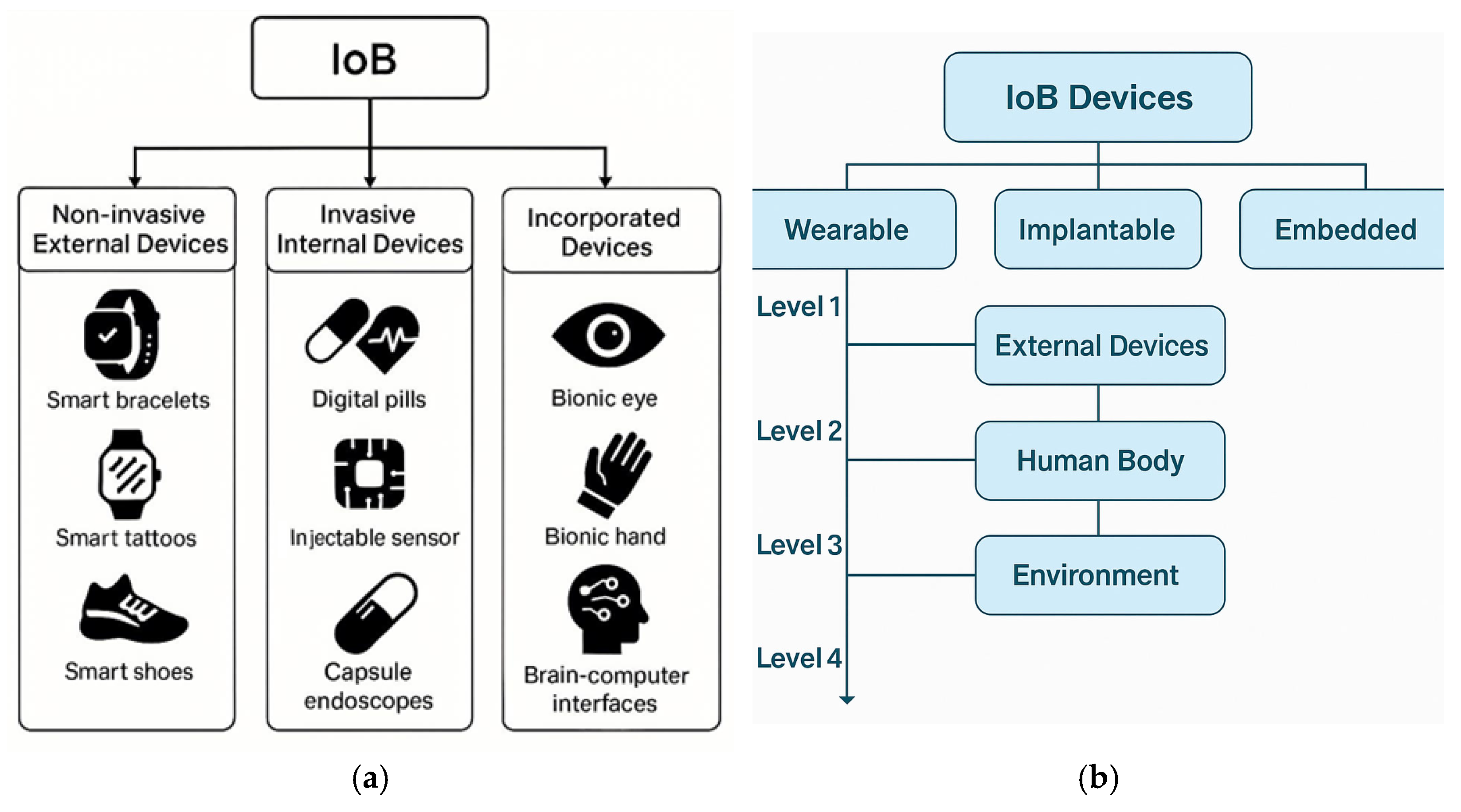 The Internet of Bodies (IoB) represents a rapidly expanding subset of the Internet of Things (IoT) in which networked devices are integrated directly with or in close proximity to the human body. These smart biomedical systems collect, analyze, and transmit physiological or behavioral data, enabling real-time interaction between the human organism and digital infrastructures [5,6,7]. This concept expands beyond traditional wearable health technologies by incorporating implantable, ingestible, and embedded devices that interact intimately with biological systems.