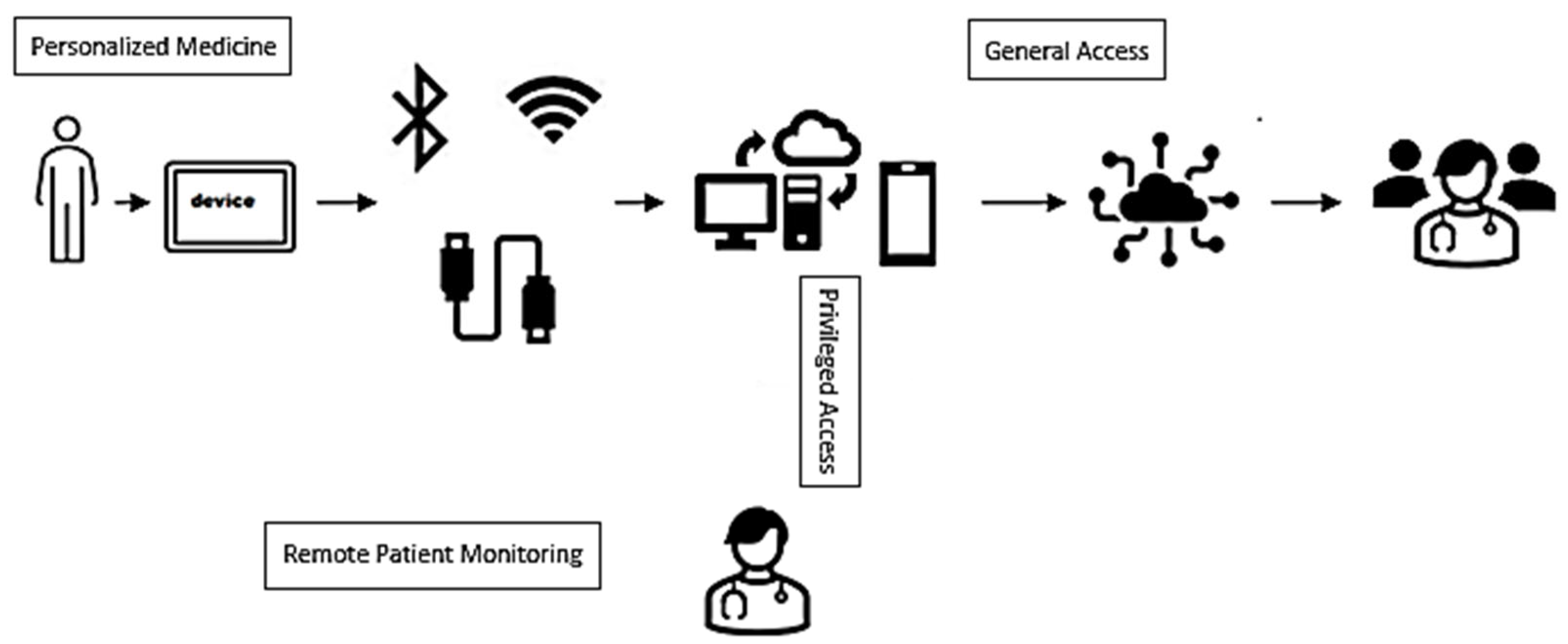 A key enabler of this shift is the Internet of Bodies (IoB), a specialized branch of the broader Internet of Things (IoT), where human bodies become data-generating platforms through the integration of wearable, implantable, and ingestible smart devices. These IoB systems can collect, analyze, and transmit physiological data in real time, enhancing preventive care, chronic disease management, and telemedicine applications [5,6,7,8,9]. The emergence of IoB also redefines the doctor–patient relationship, turning it into a continuous digital feedback loop rather than a series of discrete interactions. If previously, this relationship was direct and exclusive, now, the Internet has become an additional participant in medical care delivery [10].