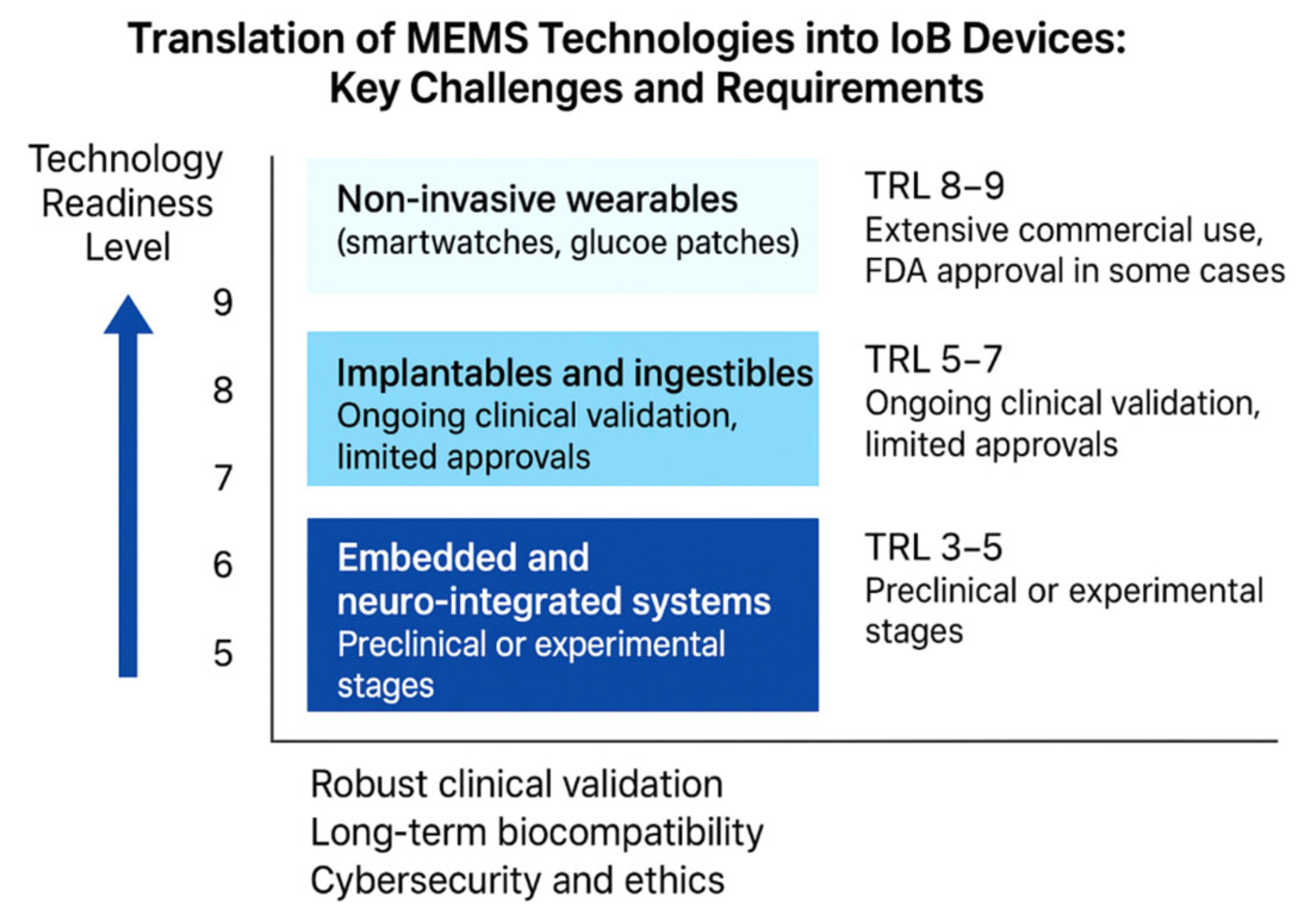 In summary, MEMS and BioMEMS technologies have evolved from passive microstructures into active, intelligent biomedical systems. Their fusion with connectivity and computation through the IoB paradigm marks the beginning of a new era of personalized, anticipatory, and highly adaptive medicine.