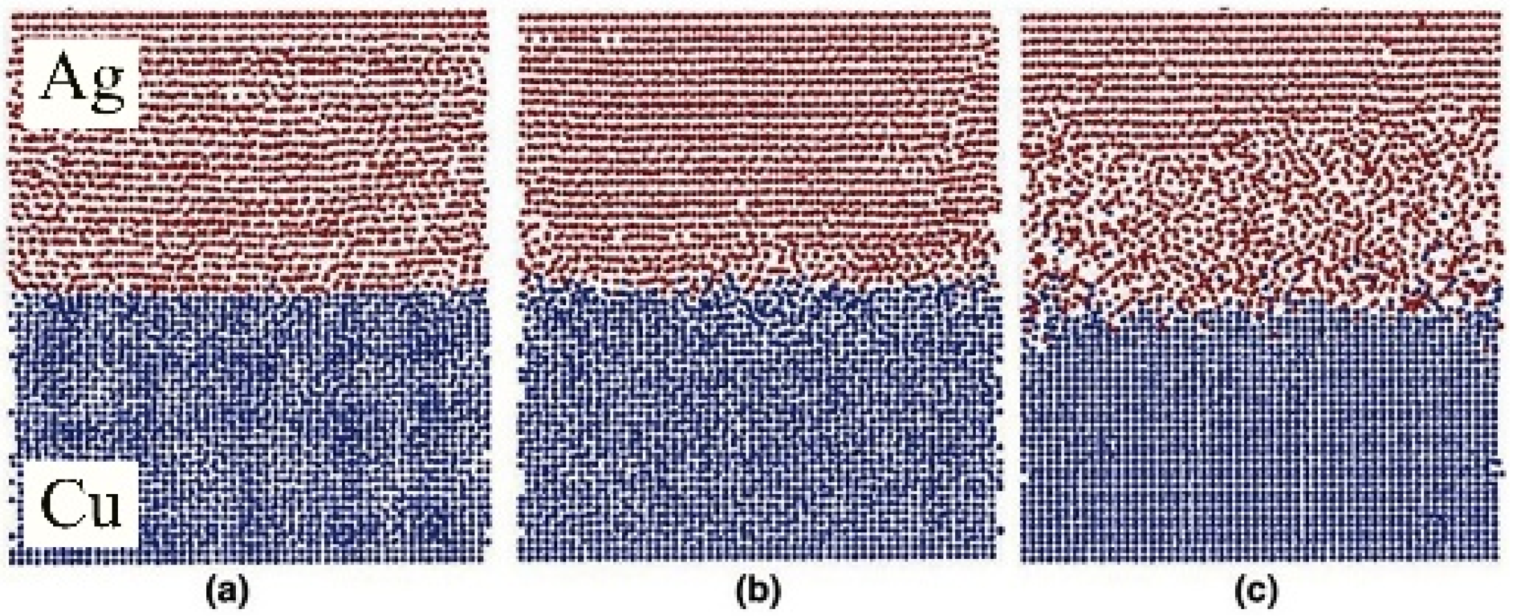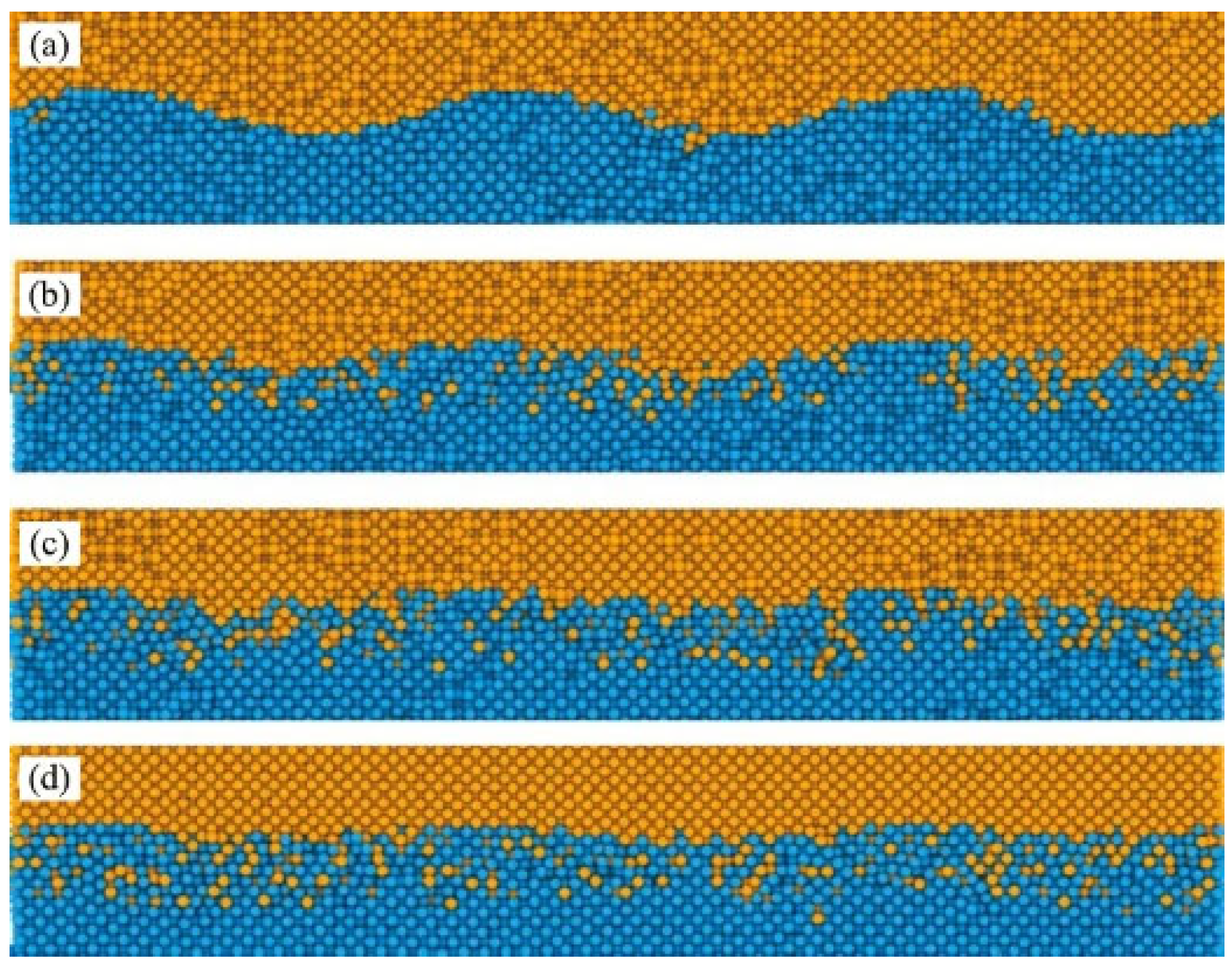 Figure 1. Simulation results demonstrated that as the reaction reached equilibrium, the Mean Square Displacement (MSD) showed a linear increase with reaction time. After approximately 9000 simulation steps, diffusion rates declined due to the formation of intermetallic compound layers that hindered further diffusion.