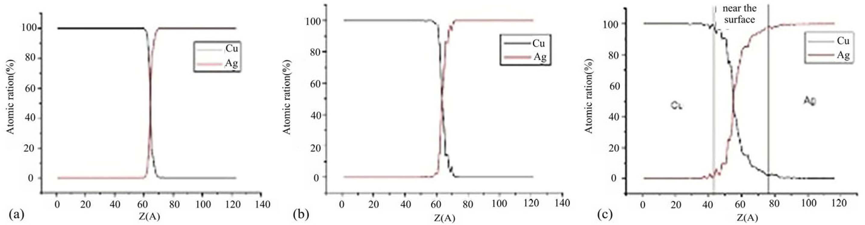 5] employed the Modified Embedded Atom Method (MEAM) potential energy model to describe intermetallic interactions, elucidating the diffusion behavior of brazing alloys in base materials at atomic scale. Their study conducted detailed analysis of diffusion mechanisms across different orientations: surface diffusion mechanisms dominated in x and y directions with comparable rates, while z-directional bulk diffusion exhibited significantly slower rates, as shown in