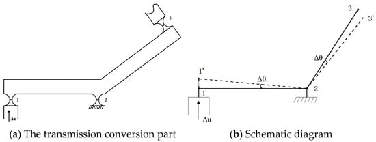 A schematic of the flexure hinge transmission conversion principle is shown in Figure 2, and is mainly composed of flexure hinge 1 connected to the input moving parts, flexure hinge 2 connected to the fixed base, flexure hinge 3 connected to the output moving parts, and rods 12 and 23, as shown in Figure 2a. Suppose that each section of the flexure hinge group is rigidly bonded and rods 12 and 23 are beam structures. A schematic of the flexure hinge transmission conversion movement is shown in the solid line in Figure 2b. When an instruction to move up, Δu, is given to the input moving part, because flexure hinge 1 is connected to the input moving part, flexure hinge 1 will also move Δu, where point 1′ is the position of point 1 after movement; because flexure hinge 2 is connected to the fixed base, rods 12 and 23 will rotate around point 2, and thus, the rotation angle Δθ will be generated. The schematic of the device after movement is shown as the dashed line in Figure 2b. Point 3′ is the position of point 3 after movement, and the rotation angle Δθ is generated, which is the output rotational displacement after transmission conversion. There are 26 flexible hinges in total in the micro-motion rotary mechanism. Since the mechanism is symmetrical, only its upper half needs to be analyzed. Among these hinges, flexible hinges 6–13 serve a guiding function but not a conversion function; hinges 4 and 5 are used to balance the lateral forces generated during the movement of hinges 1–3. Therefore, only hinges 1–3 are responsible for the absolute conversion of the angle magnitude, as shown in Figure 2.