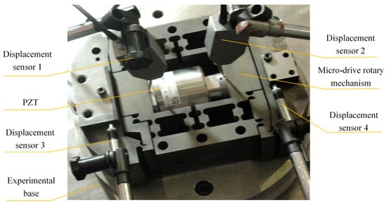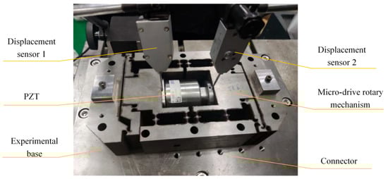 The setup of the experiment assessing the drive characteristics is shown in Figure 6. To minimize the impact of temperature, the experiment was conducted under constant temperature conditions (20–22 °C, with fluctuations less than 2 °C). The experimental device is mainly composed of the experimental base, P235.1s PZT, micro-drive rotary mechanism, connector, two-side displacement sensors (Zhongyuan Measurement DGC-6PG/A: measurement range ±0.3 mm, total stroke 1–1.5 mm, linear error ±0.5%, and repeatability error 0.05 μm), data recorder, piezoelectric ceramic controller, etc. By changing the driving voltage U, the displacement variation of the micro-drive rotary mechanism along the Y-axis is measured by the sided displacement sensors 1 and 2, which are δy1 and δy2, respectively. Because the PZT is driven symmetrically in the micro-drive rotary mechanism, the maximum displacement of unilateral drive is 7.5 μm. The driving displacement Δv of PZT can be expressed as follows: