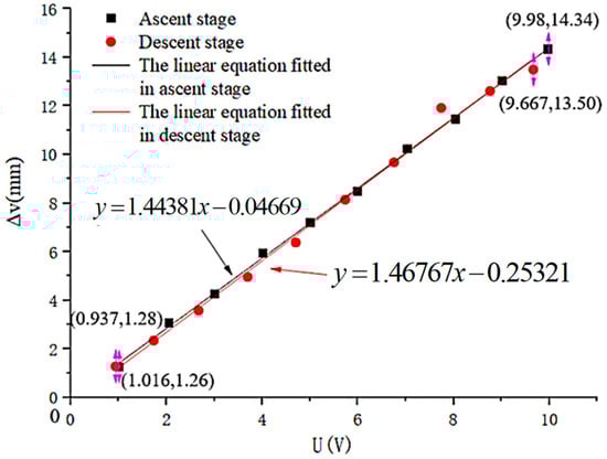The fit of the linear equation between the drive voltage U and the linear motion displacement Δv of the mechanism in the ascending stage is as follows: