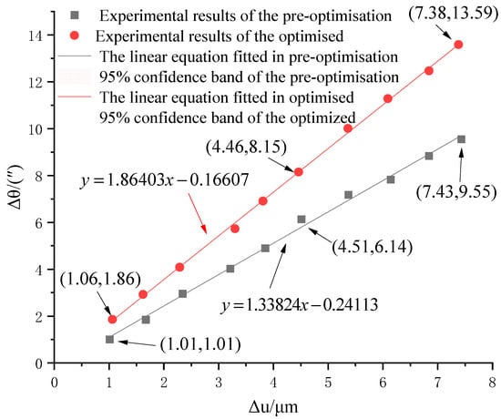 Different linear input displacement values, Δu, can be obtained using Equation (25), and then the rotary angle Δθ of the corresponding micro-drive rotary mechanism can be obtained using Equation (26). The experimental results of the micro-drive rotary mechanism before and after optimization are shown in Table 3 and Figure 9.