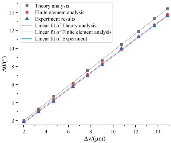 To analyze the linear input displacement Δv of the PZT and the rotary angle Δθ of the optimized micro-drive rotary mechanism, linear fits were obtained using three methods, theory analysis, finite element analysis, and the experimental results, and the linear fits are shown in Figure 10.