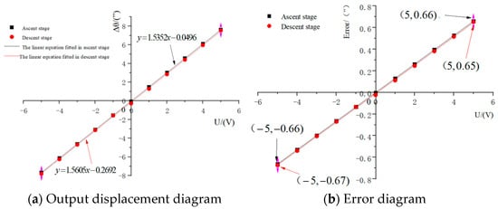 The experiment was conducted five times, and the average value was taken as the final experimental data result. Then, linear programming was performed on the final experimental data. The drive performance of the micro-drive rotary mechanism was tested in the ascending stage (when the driving voltage U increases) and the descending stage (when the driving voltage U decreases). The experimental results are shown in Figure 7.