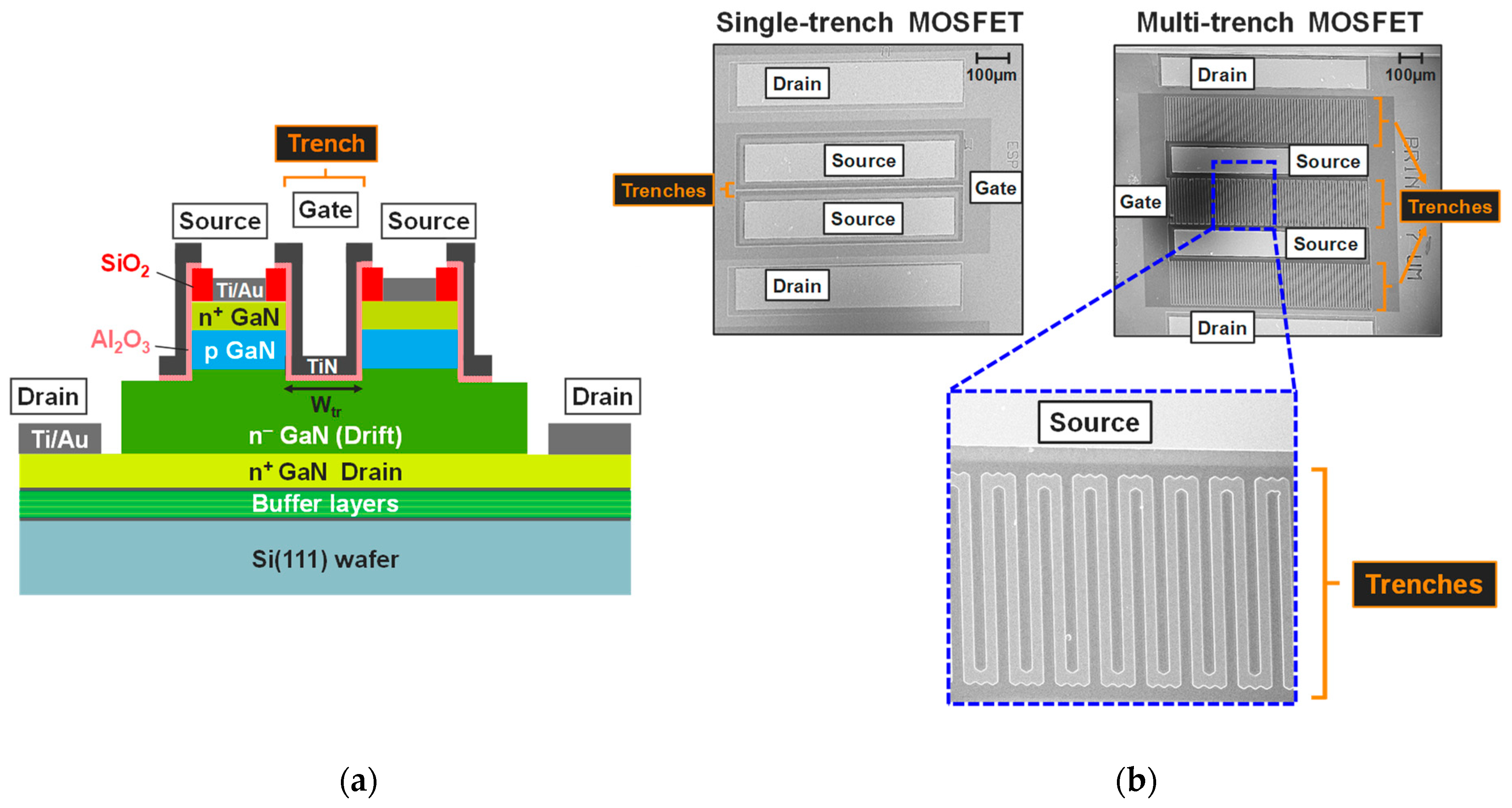 - Zhu, R.; Jiang, H.; Tang, C.W.; Lau, K.M. GaN Quasi-Vertical Trench MOSFETs Grown on Si Substrate with ON-Current Exceeding 1 A. Appl. Phys. Express 2022, 15, 121004. [Google Scholar] [CrossRef]