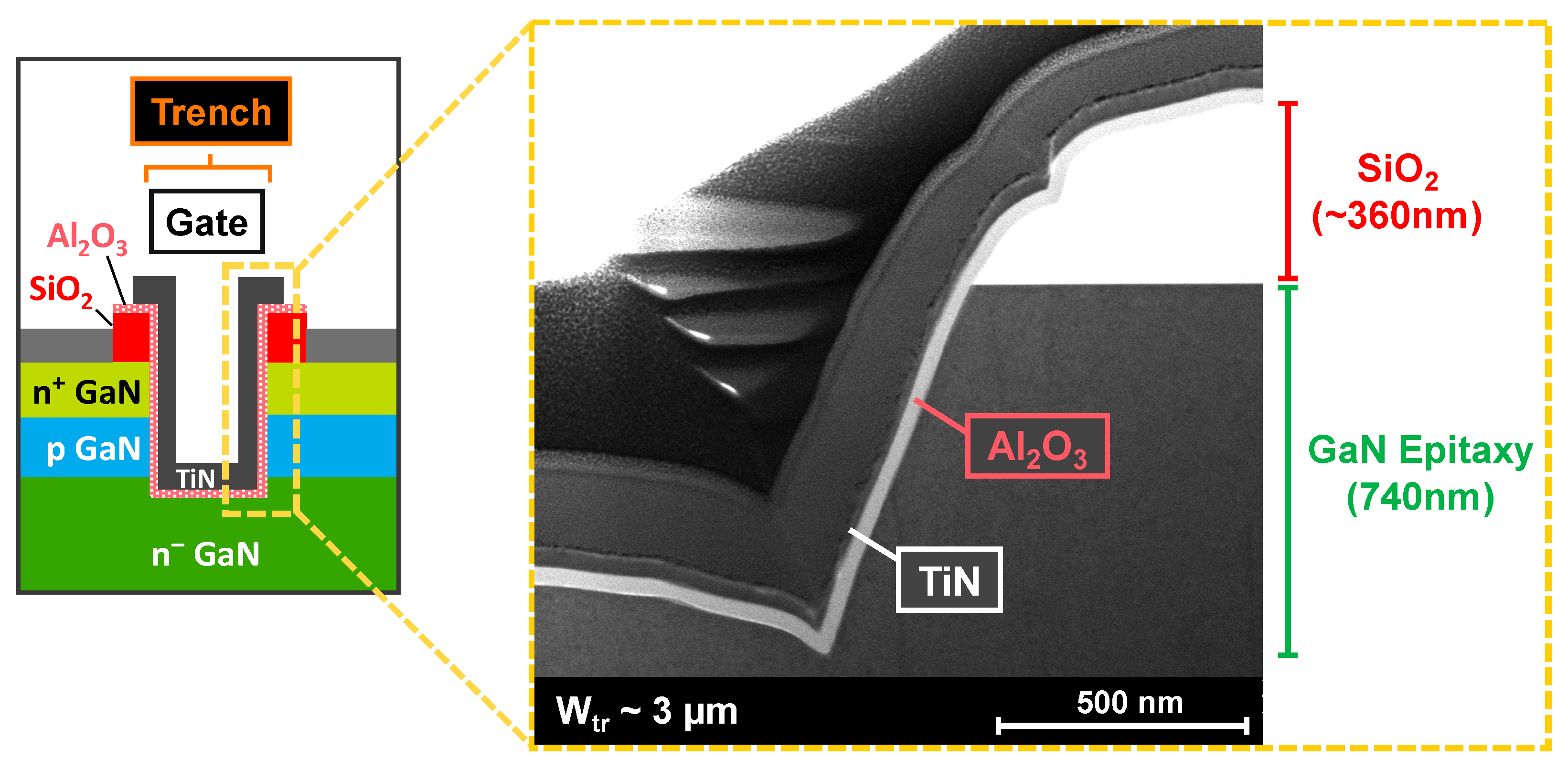 - Ruzzarin, M.; Geens, K.; Borga, M.; Liang, H.; You, S.; Bakeroot, B.; Decoutere, S.; De Santi, C.; Neviani, A.; Meneghini, M.; et al. Exploration of Gate Trench Module for Vertical GaN Devices. Microelectron. Reliab. 2020, 114, 113828. [Google Scholar] [CrossRef]