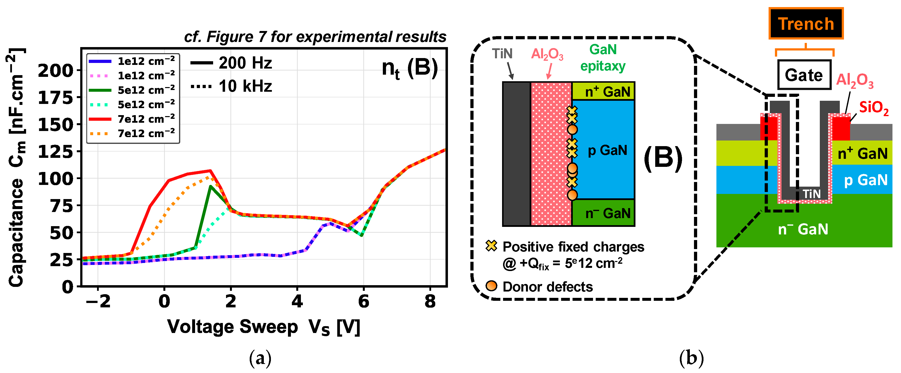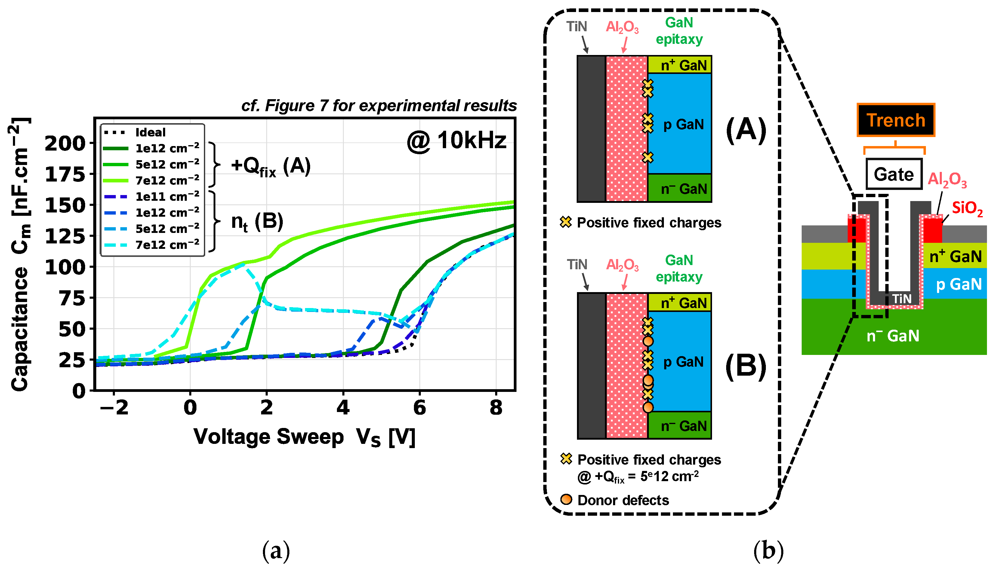 - Mukherjee, K.; De Santi, C.; You, S.; Geens, K.; Borga, M.; Decoutere, S.; Bakeroot, B.; Diehle, P.; Altmann, F.; Meneghesso, G.; et al. Study and Characterization of GaN MOS Capacitors: Planar vs. Trench Topographies. Appl. Phys. Lett. 2022, 120, 143501. [Google Scholar] [CrossRef]