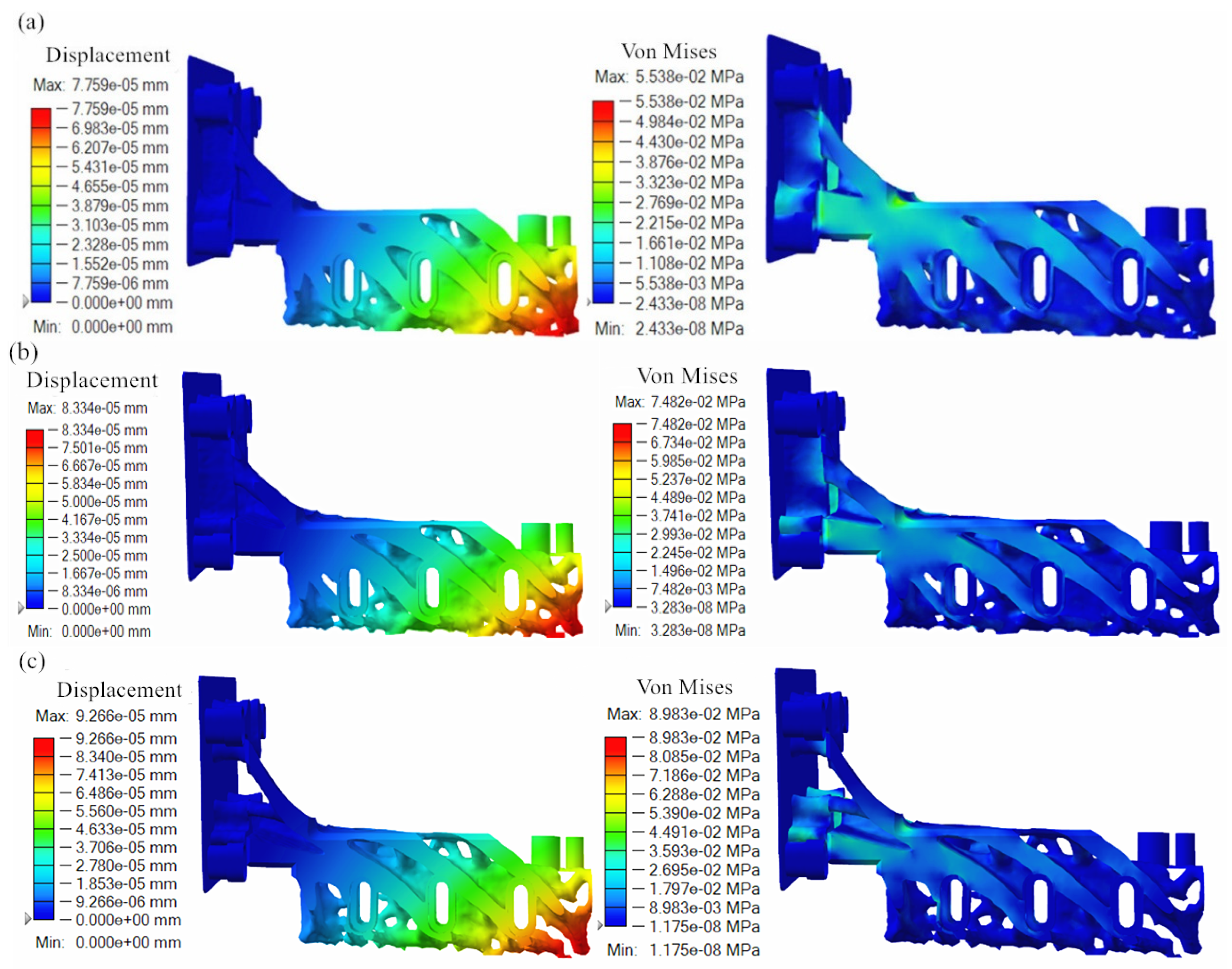 - The topological optimization’s displacement and maximum stress of the powder-spreading arm under different quality targets are relatively small, which can meet mechanical performance requirements. Based on the shape of the part after topological optimization, the powder-spreading arm under the 25% quality target maintains integrity at the fixed hole while achieving a significant reduction in mass.