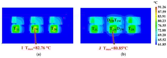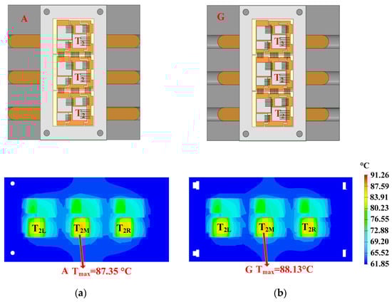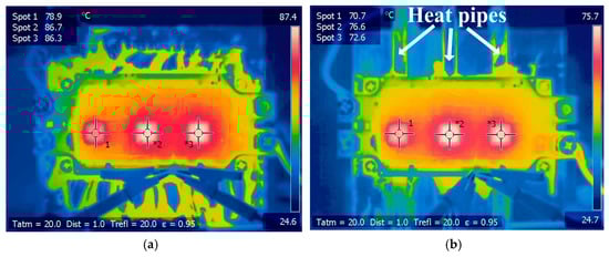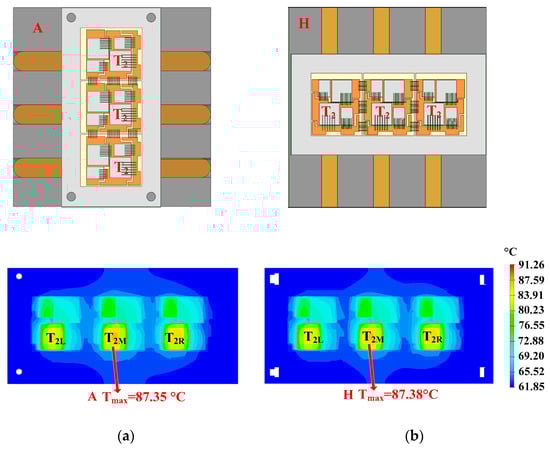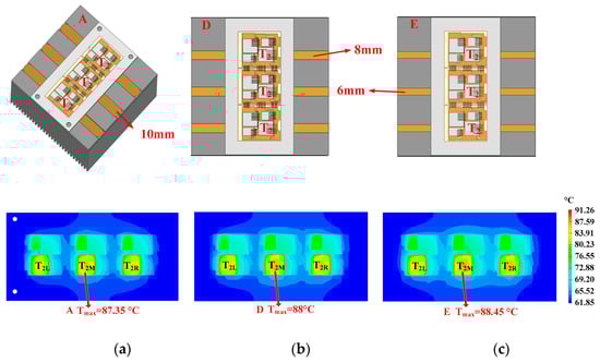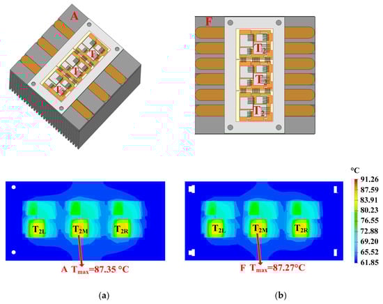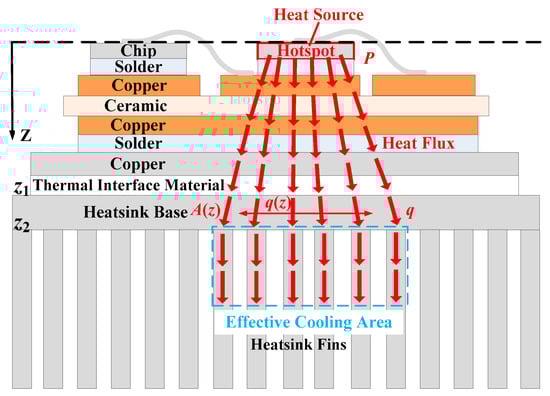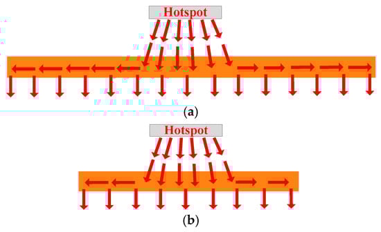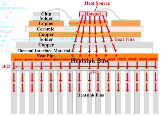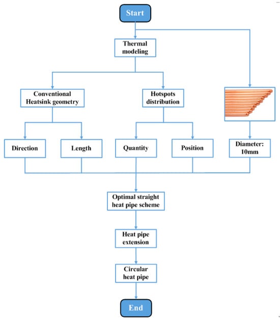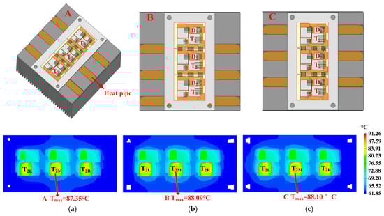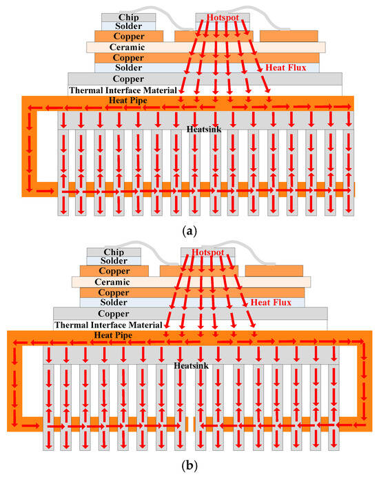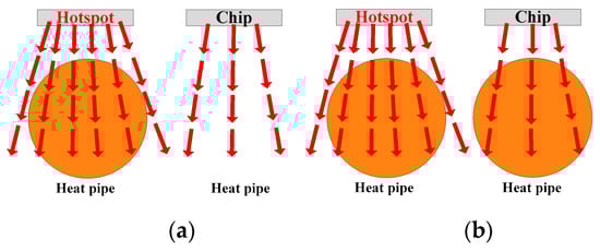 - Quantity: As can be seen in Figure 12, a heat pipe that is directly under the hotspot chip and with maximum thickness can fully cover the thermal path. If some heat pipes are added, additional heat pipes will be located below normal chips with lower power losses. As additional heat pipes are not on the thermal path of the hotspot chip, they have little effect on reducing the heat flux of hotspot chips.