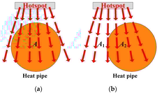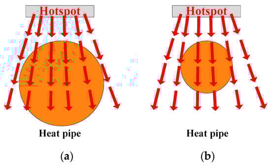 - Diameter: As shown in Figure 11, a thicker heat pipe can cover the thermal path as extensively as possible. Similarly, the heat pipe can absorb and spread the heat of the hotspot chip, reducing the heat flux as much as possible. As the heat pipe gradually becomes thinner, the heat pipe cannot fully cover the thermal path. Thus, the effectiveness of heat pipes in absorbing and transmitting heat gradually weakens.