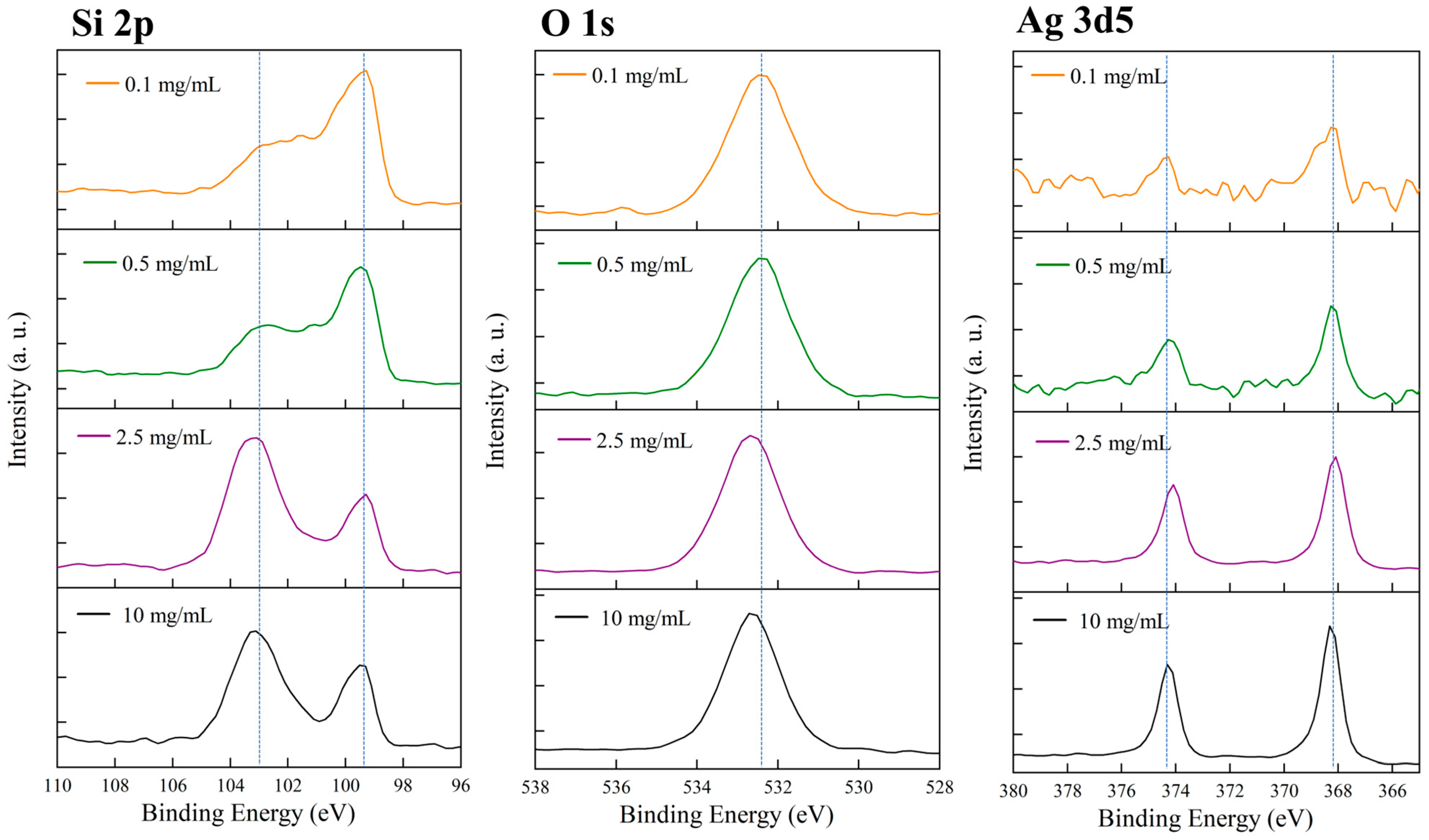3.9. Surface Chemical Composition Analysis of Samples with Different Silver Nanoparticle Concentrations