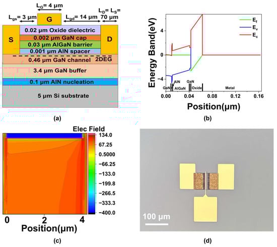 To validate the simulation model, conventional Al2O3 gate dielectric HEMTs were fabricated. The process began with mesa isolation by ICP etching using a Cl2/BCl3/Ar mixture (10/25/5 sccm). Source and drain electrodes were formed via electron-beam deposition of Ti/Al/Ni/Au (20/120/45/55 nm), followed by rapid thermal annealing at 850 °C for 30 s in N2 to achieve ohmic contacts. A 20 nm Al2O3 gate dielectric was deposited by ALD at 160 °C, and Ni/Au (80/50 nm) was evaporated to form the Schottky gate. A micrograph of the completed Al2O3 MOS-HEMT is shown in Figure 1d.