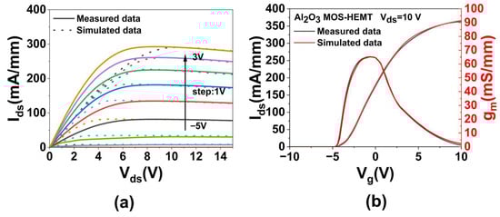 Measured and simulated results of the Al2O3 MOS-HEMT: (a) DC output performance, (b) transfer characteristics.