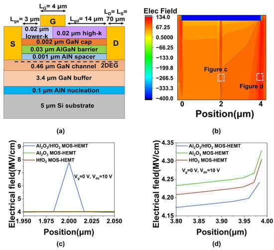 However, the high-frequency performance and voltage withstand characteristics of AlGaN/GaN HEMTs are inherently trade-offs, posing significant challenges for co-optimization. Current breakdown voltage enhancement strategies include gate-drain spacing extension [9], gate lengthening [10], and MOS-structure integration [11]. Since dimensional scaling substantially increases on-resistance (Ron), degrading power density and high-frequency characteristics, we implement MOS architectures for balanced performance. This approach deposits high-k gate dielectrics between metal and semiconductor interfaces [12], including hafnium-based oxides (e.g., HfO2 [13], HfSiOx [14], HfZrOx [15]), aluminum-based oxides (Al2O3 [16]), and zirconium-based oxides (ZrO2 [17]). In this context, “high-k” refers to dielectric materials with relative permittivity significantly higher than that of SiO2 (k ≈ 3.9), typically exceeding 10, such as HfO2 (k ≈ 25) and HfZrO (k ≈ 30). Al2O3 (k ≈ 9) is considered a moderate-to-high-k material. Although improving breakdown robustness, these high-k layers inevitably impose cut-off frequency penalties [18]. Notably, breakdown is typically localized, whereas frequency characteristics are uniform and holistic. This difference arises from non-uniform electric field distribution within the device: electric field concentration at the gate edge amplifies impact ionization, ultimately triggering localized avalanche breakdown. Conversely, the homogeneity of frequency characteristics relies on holistic carrier transport throughout the channel, which is governed by the statistically averaged properties of carriers (e.g., density, mobility, and velocity distribution) rather than local electric field peaks. Therefore, we propose localized reinforcement to enhance the device’s cut-off frequency while maintaining high breakdown voltage. Localized reinforcement refers to depositing the high-k dielectric layer at the drain-side gate edge where electric field crowding induces breakdown, while lower-k materials occupy low-field regions to minimize equivalent gate capacitance.