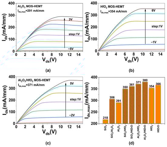 The DC output performances (Ids-Vds) of the (a) Al2O3, (b) HfO2, (c) Al2O3/HfO2 MOS-HEMT. (d) The Ids,max of all the devices.