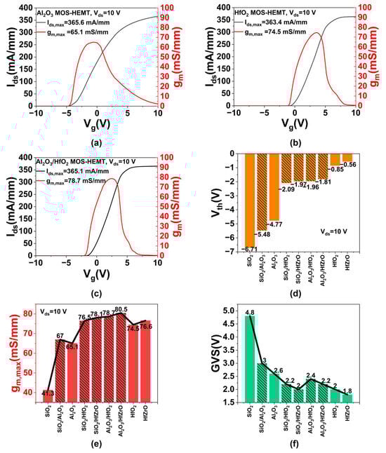 The transfer characteristics of (a) Al2O3, (b) HfO2 and (c) Al2O3/HfO2 MOS-HEMT. The (d) Vth, (e) gm,max and (f) GVS values of all devices.