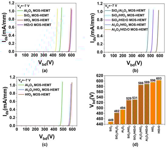 The breakdown voltage (Vbd) is defined as the Vds at which Vbd exceeds 1 mA/mm while Vg is held at −7 V to maintain the off-state. Figure 6a shows the Vbd of four uniform gate dielectric devices. With increasing dielectric constant, Vbd rises significantly [33]. Similarly, Figure 6b presents Vbd for five composite dielectric devices, where Vbd also increases with equivalent permittivity. Figure 6c compares Vbd among Al2O3, HfO2, and Al2O3/HfO2 MOS-HEMTs. The Al2O3/HfO2 MOS-HEMT exhibits Vbd nearly identical to the HfO2 device, with only a 1.7% reduction, attributable to non-uniform field distribution leading to localized breakdown near the gate-drain side [34], rather than uniform breakdown. Figure 6d summarizes Vbd across all nine devices. Vbd increases consistently with dielectric constant from left to right. Moreover, the breakdown voltages of SiO2/Al2O3, Al2O3/HfO2, and Al2O3/HfZrO MOS-HEMTs closely match those of their uniform higher-k counterparts, confirming the feasibility and effectiveness of LEFT in improving breakdown performance and device reliability.