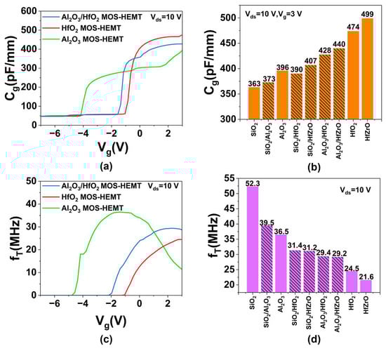 (a) The Cg-Vg characteristics of Al2O3, HfO2, and Al2O3/HfO2 MOS-HEMT. (b) The Cg values of all devices. (c) The fT-Vg characteristics of Al2O3, HfO2, and Al2O3/HfO2 MOS-HEMT. (d) The maximum fT values of all devices.