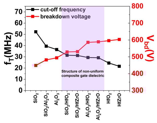the increase in fT is mainly due to reduced Cg, with a minor contribution from increased gm. As shown in Figure 7d, fT generally decreases with higher dielectric constant [37]. Compared to their uniform higher-k counterparts, the Al2O3/HfZrO, SiO2/Al2O3, SiO2/HfO2, and SiO2/HfZrO MOS-HEMTs show fT improvements of 35.2%, 8.2%, 28.2%, and 44.4%, respectively. These results demonstrate that composite gate dielectrics with LEFT effectively alleviate the fT degradation typical of high-k devices, enabling balanced frequency performance.