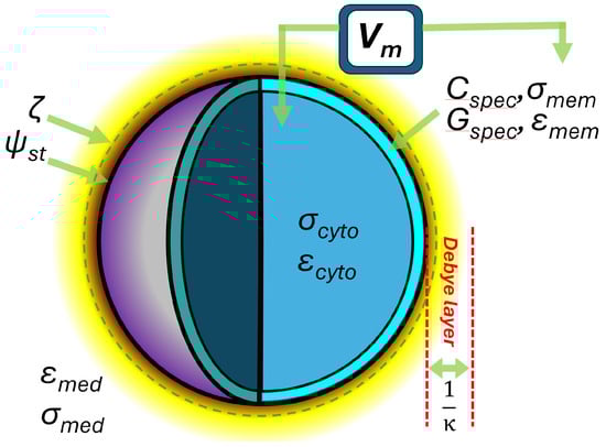 The key elements of the cellular electrome model presented in this paper. The cell surface is characterized by its surface potential ψst at the Stern layer boundary and ζ-potential a short distance (ca. 1–2 nm) beyond this; the thickness of the diffuse (Debye) layer of the electrical double layer; the conductivity σ and permittivity ε of the membrane and cytoplasm (subscripts mem and cyto, respectively), with the latter giving rise to the specific membrane capacitance Cspec and conductance Gspec. Finally, the differences in extracellular and intracellular ion content give rise to the membrane potential Vm. Not illustrated: cell radius rcell and membrane thickness t.