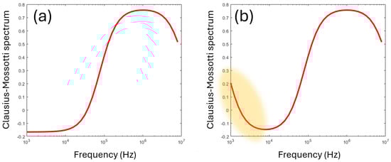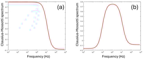 Typical Clausius–Mossotti spectra for (a) a homogeneous sphere, per Equation (2), and (b) a shelled sphere, with a thin membrane surrounding a conducting core, per Equation (4). The latter model is commonly used for modeling cells.
