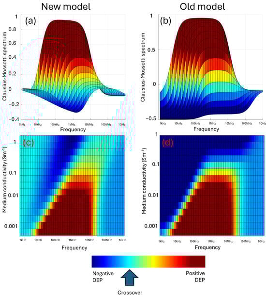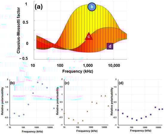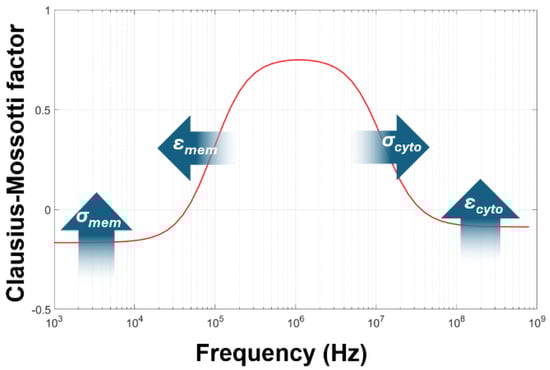 Whether the particle experiences positive or negative DEP (and the magnitude of force experienced) is defined by the relationship between the polarizability of the particle at the applied frequency, relative to the polarizability of surrounding medium. Furthermore, the same particle may experience positive DEP at some frequencies, and negative DEP or no force at all at others. This is shown schematically in Figure A2. The relationship that describes the relative polarizability of the particle with respect to the suspending medium is given by the Clausius–Mossotti factor, the subject of this paper.