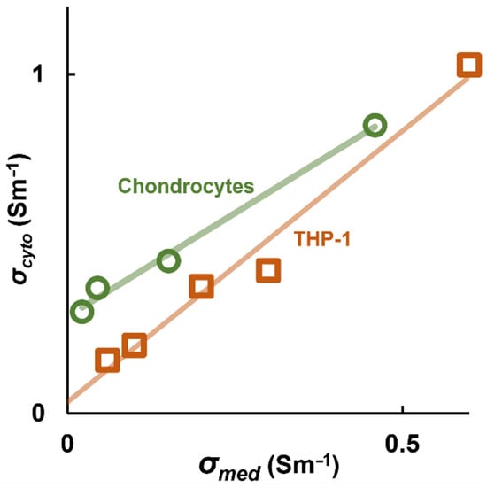 The measured value of σcyto from the Clausius–Mossotti factor scales linearly with medium conductivity σmed, as illustrated in here with two example cell types, the THP-1 monocyte line and primary bovine chondrocytes. Data originally published by Hughes et al. [63].