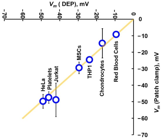 A comparison of Vm values calculated using Equation (13) for a range of cells, plotted against the mean of published values of Vm for the same cell types when measured using patch clamp. The yellow line indicates the line of identity, where DEP and patch clamp yield the same result. Data originally presented by Hughes et al. [63].