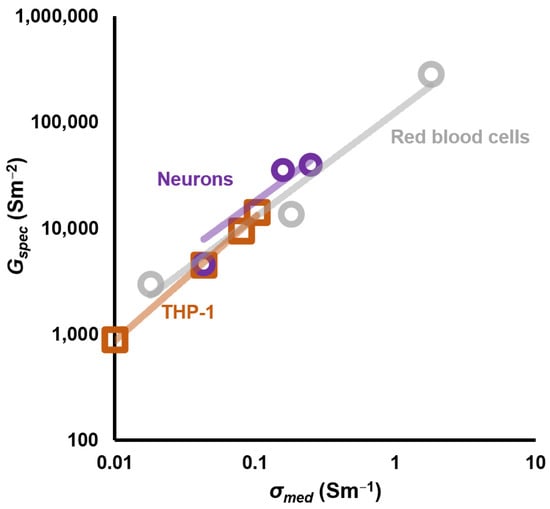 and where η is the viscosity. However, this did not fit the observed behavior in RBCs or other cells (such as shown in Figure 6)—in particular, the dependence of observed values of Gspec at higher conductivities, which have a strong σmed correlation. Empirical fitting to data [68] revealed that an excellent fit was achieved when: