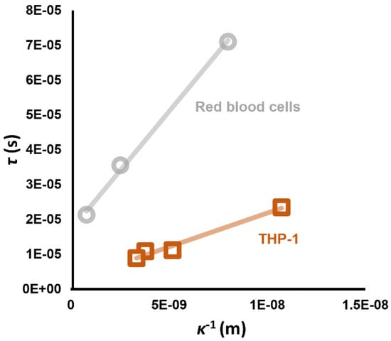 If we examine Equation (19), we find that Gspec is described by the sum of two components; the first (σmed/2r) contains no variables relating to the cell other than the cell radius rcell. We can examine the contribution of this component to the Tick effect by calculating Equation (22) using Equation (19) to calculate Gspec and setting ζ to 0 mV. A graph of τ vs. κ−1 shows a linear relationship, with a slope that is very similar to that observed for cells with a low value of Vm, such as the RBCs in Figure 8. Where cells had more polarized Vm, the second component deriving from Equation (20) acts to decrease the gradient, with THP-1 cells (Vm ≈ −25 mV), having a lower gradient, and neurons (Vm ≈ −70 mV) being even lower [68]. Modeling of the effect using this set of equations was found to accurately predict the time constant when Equation (13) was used to first predict Vm from the standard Clausius–Mossotti model, and then using this to calculate τ.