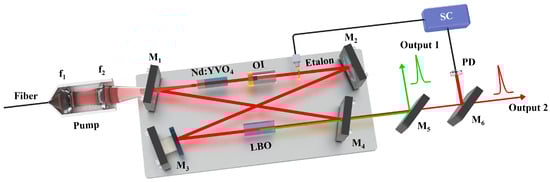 - Radnatarov, D.; Kobtsev, S.; Khripunov, S.; Lunin, V. 240-GHz continuously frequency-tuneable Nd:YVO4/LBO laser with two intra-cavity locked etalons. Opt. Express 2015, 23, 27322–27327. [Google Scholar] [CrossRef]