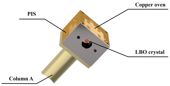 The schematic diagram of the designed high-power ASS SF CW wideband-tunable dual-wavelength 1064/532 nm laser was shown in Figure 1. The pump source was a fiber-coupled laser diode (LD) (DILAS M1F4S22-888.3-80C-IS30.3M6O3T3W12) with a center wavelength of 888 nm. The diameter and numerical aperture (NA) of the coupling fiber were 400 µm and 0.22, respectively. In order to achieve the best mode-matching between the pump and oscillating fundamental-wave laser modes, a telescope system consisting of two lenses f1 and f2 was designed. The focal length of f1 and f2 were 30 mm and 80 mm, respectively. The resonator adopted the classical bow-tie architecture, and it consisted of four mirrors (M1, M2, M3, M4). The input coupler mirror M1 was a concave-convex mirror with curvature radius of 1500 mm, and it was coated with high-transmission (HT) film at 888 nm (T888nm > 95%) and high-reflection (HR) film at 1064 nm (R1064nm > 99.8%). The plane convex mirror M2 and plane concave mirror M3 were both coated with HR films at 1064 nm (R1064nm > 99.8%). The output coupler mirror M4 was a plane concave mirror and coated with HT film at 532 nm (T532nm > 99.8%) and partial transmission film of 4% at 1064 nm (T1064nm = 4%), so as to ensure dual-wavelength laser output while achieving the 10 W-level of optimal output power at both 1064 nm and 532 nm laser. The curvature radius of M2 was also 1500 mm, and the curvature radii of M3 and M4 were both 100 mm (R = −100 mm). An α-cut composite YVO4/Nd:YVO4 rod with the size of 3 mm × 3 mm × 23 mm acted as the gain medium, who included an un-doped end cap of 3 mm and an Nd-doped part of 20 mm. The concentration of the Nd-doped part was 0.8%. A wedge angle of 1.5 degree at the rear end face was designed and fabricated to purify the polarization state of the oscillating laser mode. Both end-faces of the gain medium were coated with the anti-reflection (AR) films at 888 nm and 1064 nm (R888,1064nm < 0.25%), as we adopted 888 nm pumping to overcome the thermal limitations of conventional 808 nm pumping in high-power Nd:YVO4 lasers. The component was encapsulated in indium foil within a copper oven adhered with a thermoelectric cooler for precise temperature control. An optical isolator (OI) comprised of a half-wave plate at 1064 nm and an 8 mm terbium gallium garnet crystal (TGG) surrounded by a permanent magnet was inserted into the resonator to ensure the unidirectional operation of the laser cavity. In order to realize the dual-wavelength output of the designed laser, a type-I noncritical phase-matching LBO crystal with the size of 3 mm × 3 mm × 18 mm was employed and placed at the beam waist between the mirror M3 and M4. Both the front end-face and the rear end-face were coated with the AR films at 1064 nm and 532 nm (R1064,532nm < 0.25%). The LBO crystal was placed in a copper oven, and wrapped in the polysulfone insulation shell (PIS) for maintaining a constant temperature. To detect accurate temperature, the thermistor was placed near the crystal. Its temperature was stabilized at the phase-matching point for second harmonic generation using a homemade precision thermoelectric controller (0.01 K). The entire oven, mounted on copper Column A, was housed in an integrated indium steel cavity with independent temperature control. The specific LBO oven device diagram was shown in Figure 2. At the same time, the horizontal-polarization 1064 nm and vertical-polarization 532 nm lasers leaked from the output coupler coated with polarization-insensitive were separated from each other by a dichroic mirror M5 which was coated with the AR film at 1064 nm (R1064nm < 0.25%) and HR film at 532 nm (R532nm > 99.8%). An uncoated quartz etalon (Φ 10 × 0.5 mm) with the bandwidth of 238.25 GHz at the reflectivity of R = 5.6% was inserted into the resonator and mounted on the rotation axis of a galvanometer scanner for the fine mode selection. A small part of 1064 nm laser was injected into the phase-lock system consisting of a photodetector (PD, ETX-500, JDSU Corporation, Milpitas, CA, USA) and a servo controller (SC) for locking the transmission peak of etalon to the oscillating mode of laser resonator. Once the goal was achieved, the laser frequency could be continuously tuned by scanning the voltage value loaded to the piezoelectric ceramics (PZT).