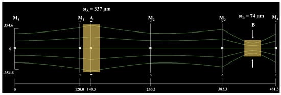 For a single-frequency CW laser with the high-power operation, the mode competition was so intense that it was very difficult to achieve the SLM operation because the gain was far larger than the loss at this time [23,24]. Moreover, the multi-longitudinal-mode (MLM) oscillation or mode-hopping of the laser easily occurred with the variation of the cavity length, which would lead to the failure of continuous frequency tuning. Therefore, it was necessary to design a thermally insensitive cavity for achieving the high power wideband continuously tunable single-frequency CW dual-wavelength laser. As shown in Figure 3, the beam transmission characteristics of the designed resonator were analyzed. The total optical length of the designed cavity was 481.3 mm. The gain medium Nd:YVO4 was placed at point A, and the beam radius of this point was set as 337 µm to maximize the pump absorption efficiency without resulting in a detrimental thermal effect. In addition, an LBO crystal was placed at point B, where the beam waist was 74 µm, to generate a 532 nm laser and introduce appropriate nonlinear losses for achieving single-frequency operation in the CW dual-wavelength laser.