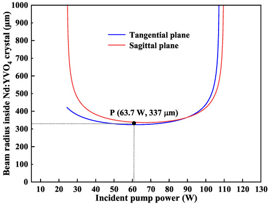 Although the thermal lensing effect of the gain crystal could be tolerated by the designed resonator, its thermal characteristic still had to be considered when the injected pump power exceeded the order of 10 watts. Therefore, we theoretically calculated the variations of the beam size in the Nd:YVO4 crystal with the increasing of the pump power, and the results were shown in Figure 4. The blue and red lines illustrated the variation trend of the beam radius at point A with respect to the incident pump power at the tangential and sagittal plane of the laser resonator, respectively. It was obvious that the resonator can operate stably when the pump power ranged from 25 W to 105 W. Specifically, when the pump power was in the range from 40 W to 90 W, both of the beam sizes at point A in the tangential and sagittal planes were approximately the same. On this basis, the beam size of the pump laser could be determined. Finally, after locking the transmission peak of the inserted etalon to the oscillating frequency of the designed resonator, the ASS SF CW tunable dual-wavelength laser was successfully achieved with output powers of 13.3 W at 1064 nm and 12.5 W at 532 nm.