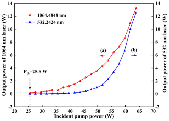 When the temperature of LBO was optimized to 147.18 °C, the stable single-frequency 1064 nm and 532 nm laser were obtained. Then the dependencies of the output powers of 1064 nm and 532 nm leaked from the resonator on the incident pump power were experimentally measured, which were recorded in Figure 5. It was seen that the threshold pump power was 25.5 W, and the output powers of 1064 and 532 nm kept increase to the maximal value during the entire process of increasing the pump power. Furthermore, benefiting from the accurate calculation of the thermal lensing effect of the gain crystal and the special design of the resonator above, the slope efficiency of the curve (a) increased with the continuous increase of the injected pump power. When the pump power was 63.7 W, the maximal output power of 13.3 W at 1064 nm was achieved. Meanwhile, owing to the inserted LBO crystal in the laser cavity, the single-frequency 532 nm laser with the output power of 12.5 W was simultaneously obtained, which was shown as curve (b). It is worth mentioned that the total optical–optical efficiency was up to 40.5%, which verified that the designed resonator and the mode matching between the oscillating mode and pump mode [25] were suitable for the high-power operation of laser. Notably, the output power showed no sign of saturation, indicating that further power scaling remains highly feasible.