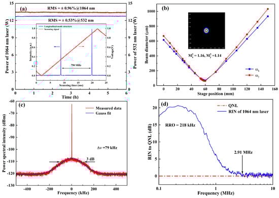 The output characteristics of the designed single-frequency CW dual-wavelength laser were measured, which were shown in Figure 6. The long-term power stability of generated dual-wavelength lasers over 6 hours were recorded in Figure 6a. The calculated RMS (Root Mean Squared) power variation values of 1064 nm and 532 nm laser were 0.96% and 0.53%, respectively. Meanwhile, the longitudinal-mode structure of the 1064 nm laser was monitored by employing a homemade Fabry–Perot cavity with a free spectral range of 750 MHz and fineness of 300, and the result was depicted in the inset of Figure 6a. Then a small part of 1064 nm laser was injected into a beam quality analyzer (M2SETVIS, Thorlabs) to record its caustic curve and corresponding spatial beam profile. The results were shown in Figure 6b, and the measured beam quality factors in the X and Y directions were 1.16 and 1.14, respectively. In addition, the linewidth of the achieved 1064 nm laser was also measured by a delayed self-heterodyne interferometer based on a fiber with the path length of 25 km, and the measured result was shown in Figure 6c. It was seen that the linewidth of the single-frequency CW 1064 nm laser was as narrow as 79 kHz. Furthermore, as shown in Figure 6d, the relative intensity noise (RIN) of the single-frequency CW 1064 nm laser was measured by employing a homemade balanced homodyne detection (Yuguang Co., Ltd., Taiyuan, China). It could be seen that the resonant relaxation oscillation (RRO) frequency and the quantum noise limit (QNL) cutoff frequency of the laser were 218 kHz and 2.91 MHz. Obviously, a single-frequency CW dual-wavelength 1064/532 nm laser with good performance and power stability, single longitudinal mode, high beam quality, narrow linewidth and low relative intensity noise was achieved.