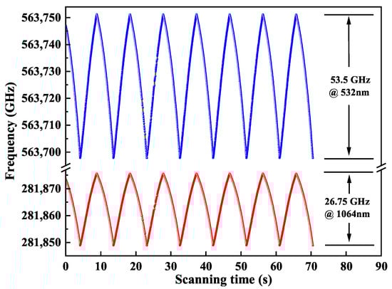 At last, a scanning signal with the frequency of 0.1 Hz was applied to the PZT for continuously changing the cavity length. A fraction of the output 1064 nm laser and 532 nm laser were separately coupled into two channels of the wavelength meter (WLM, WS6, High Finesses Laser and Electronic System) to record the frequency tuning data. The results were plotted in Figure 7. Benefiting from our designed thermally insensitive resonator with ultra-wide stable region, the wavelengths of the single-frequency CW dual-wavelength laser at 1064 nm and 532 nm can be continuously tuned from 281,848.90 GHz to 281,875.65 GHz and 563,697.80 GHz to 563,751.30 GHz, respectively. The obtained maximal continuously frequency tuning ranges were 26.75 GHz and 53.5 GHz, respectively, which can well meet the requirement of atomic physics, precision measurements or other fields.