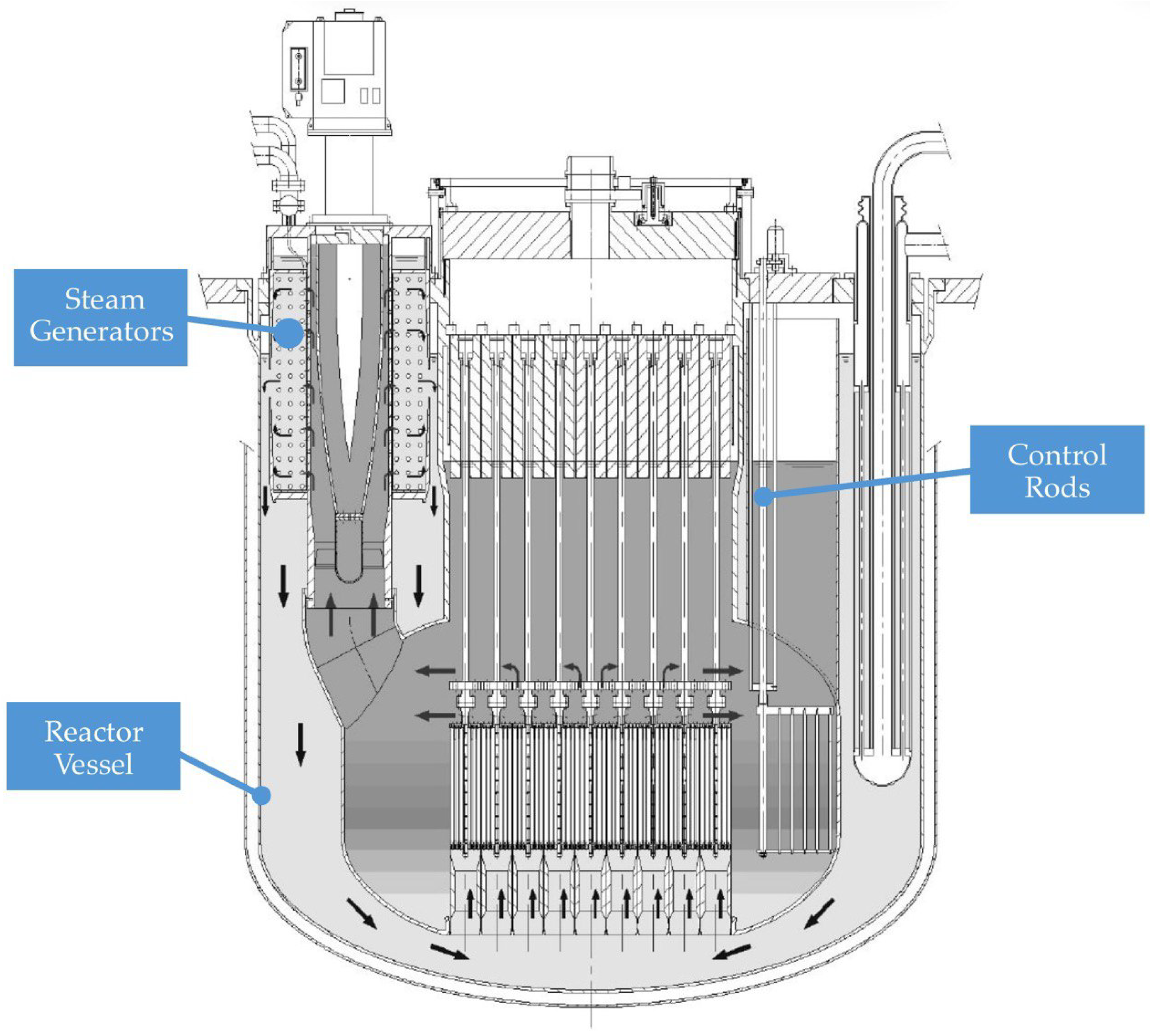 Figure 1. Design schematic of newcleo’s LFR-AS-200, highlighting the three key components analyzed in this study: the reactor vessel, control rods, and steam generator.