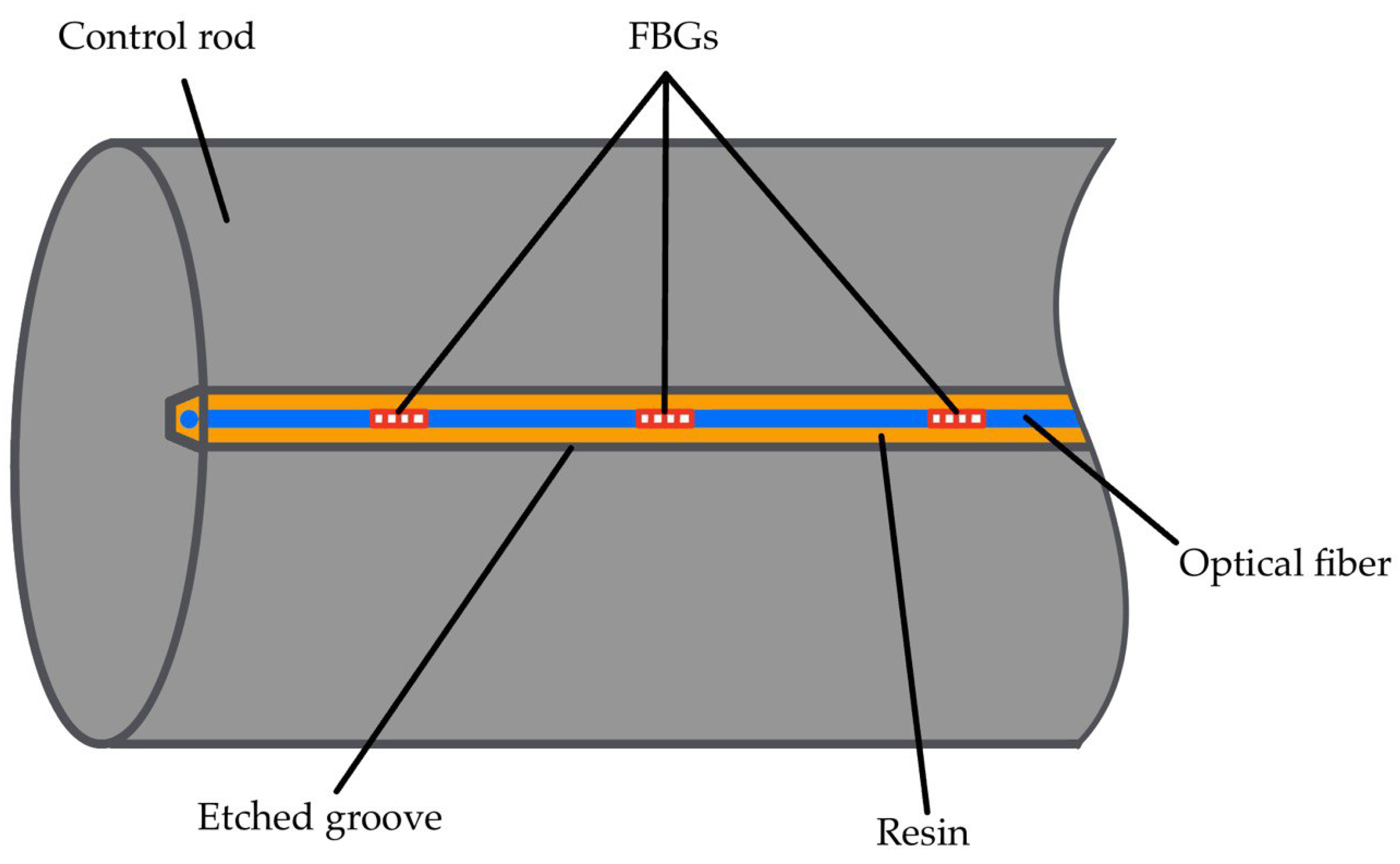 Figure 2. Schematic of a possible optical fiber integration onto a control rod. Optical fiber (blue) is embedded within a machined groove (gray borders), filled with high-temperature, radiation-resistant resin (orange), and possibly encased in a stainless steel tube. The fiber incorporates multiple FBGs (red) for distributed temperature monitoring along the control rod (gray). This multi-layered arrangement ensures protection from molten lead, mechanical stresses, thermal expansion mismatch, and radiation while enabling reliable FBG-based sensing. A similar design, though developed for a different application, was reported by De Pauw et al. [57].