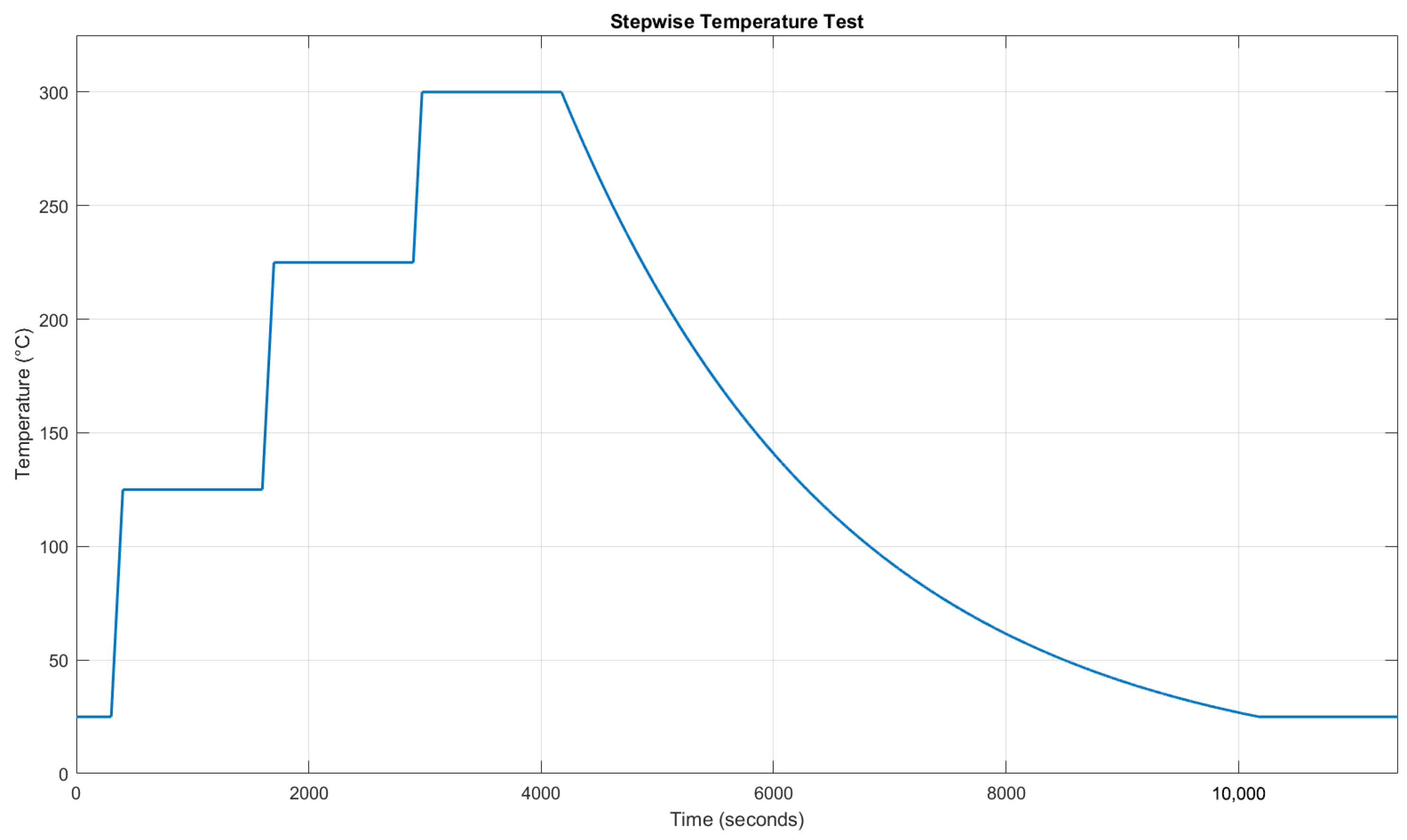 Figure 5. Stepwise temperature cycle example. Here, proposed a thermal test with a heating rate of 60 °C/min is proposed, including a holding phase of 20 min every 100 °C. Once the maximum operating temperature is reached, the chamber is turned off to allow it to naturally cool down to room temperature (this is an estimate close to the required time for cooling).